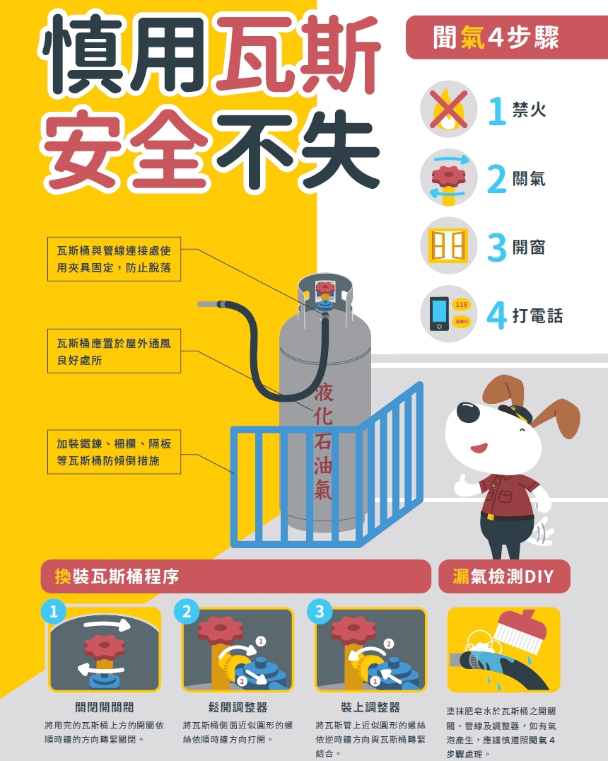 備 註:本網頁部份資訊係參考「內政部消防署-消防防災館-瓦斯使用安全」製作,如欲查詢更詳細資料請自行至內政部消防署-消防防災館網站下載。